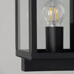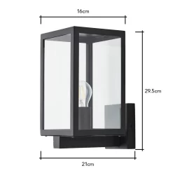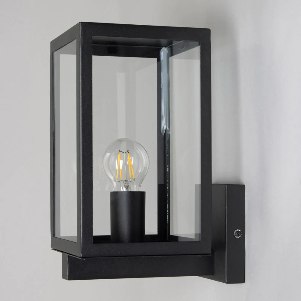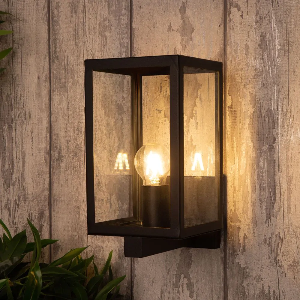 Bring a sophisticated aesthetic to the outside of your home with the Mateo Glass Panel Outdoor Wall Light. This wall light features a sleek black finish and has a box lantern design, putting a modern spin on the classical lantern design. It also features stunning clear glass panels which display the bulb within, looking ideal when paired with a separately sold vintage filament light bulb, and is IP44 rated for water resistance against outdoor weather conditions.