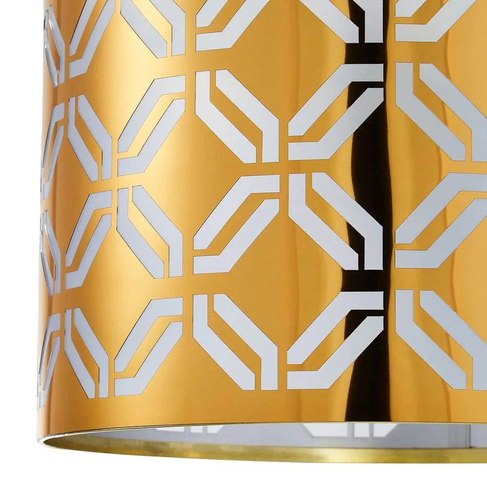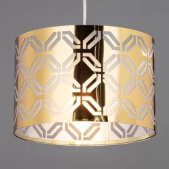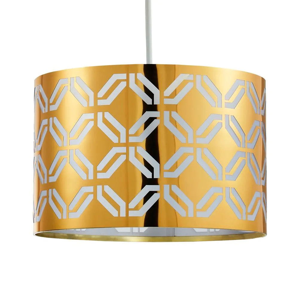 A statement lighting accessory, the new Metallic Lasered shade features a glamorous, brass finish that provides a beautiful, shimmering pop of colour to any space. The metallic base is adorned with an arrangement of cut detailing, directing the light within into a stunning display throughout your room, complimenting the brass tones and creating an accented centrepiece for any space.