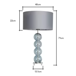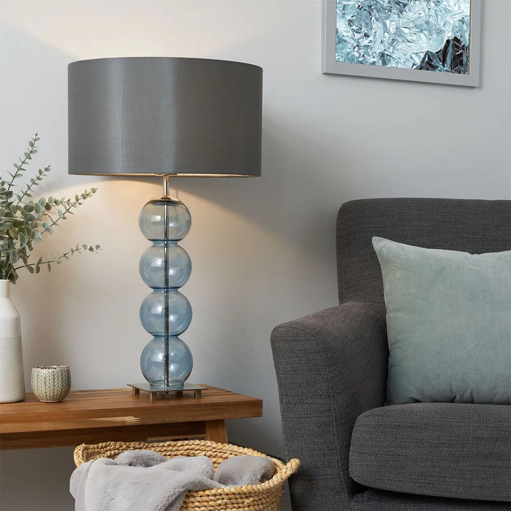 Accentuate a post modern aesthetic with the Metro Ball Stacked Table Lamp with Blue Glass Base. The pop of blue of this table lamp is a wonderful accent to the geometric shape. The cylindrical shape paired with the dark grey finish of the lampshade creates a luxurious look.