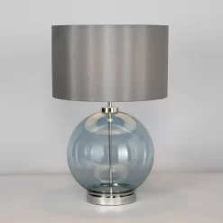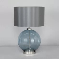 Add a striking modern accent with our Metro Blue Glass Sphere Table Lamp. The blue hue of this table lamp is a wonderful way of adding colour to a sleek minimalist aesthetic. The grey lampshade diffuses a warm glow.