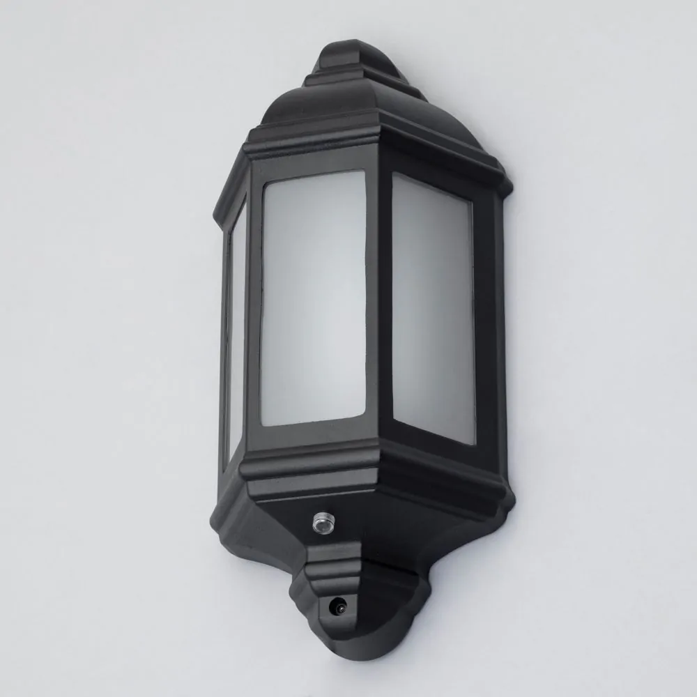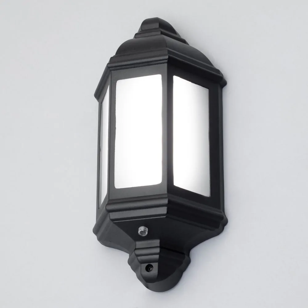 Make an innovative lighting addition to your home with the Milne Outdoor LED Half Wall Lantern. This wall light features photocell technology meaning that it can detect when there are lower natural light levels outside and brighten up accordingly. It also has a modern black finish, a traditional lantern design and 3 beautiful frosted glass panes which diffuse a gorgeous glow onto the exterior of your home.