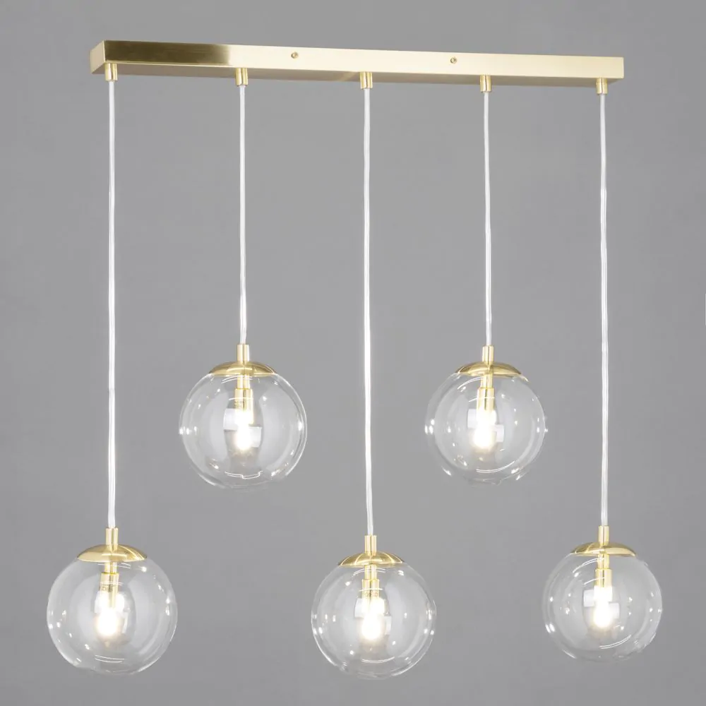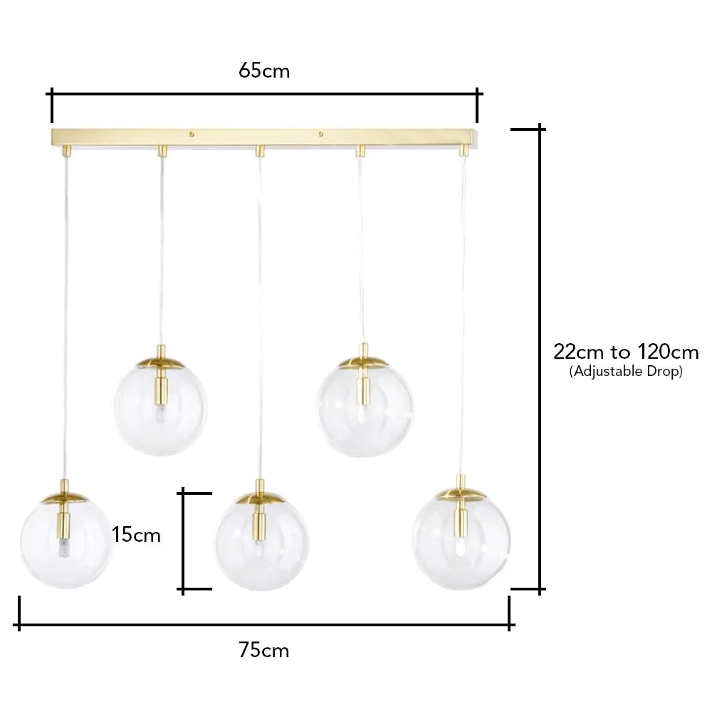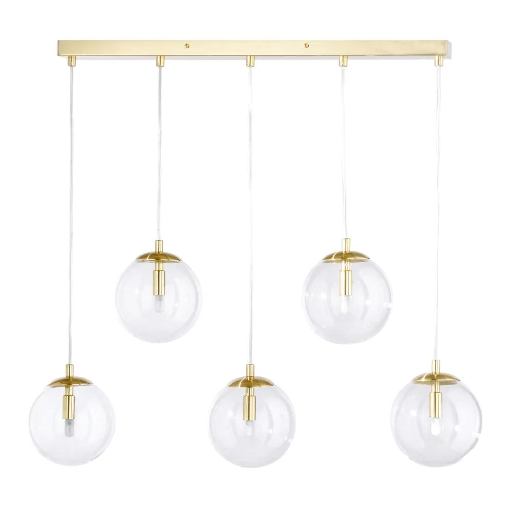 Bring a decorative edge to your interior with the Milton 5 Light Pendant Bar. With a gold finish that brings a feeling of decadence, this pendant bar features 5 individual hanging lights each complete with a spherical glass shade. Hang this ceiling pendant over a kitchen island, breakfast bar or dining room table for a luxurious look in your kitchen or diner.