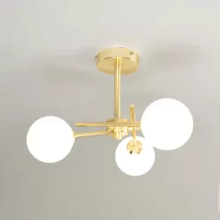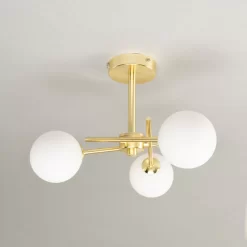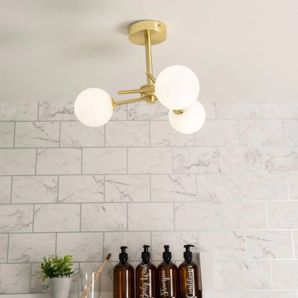 Retro lighting for your home décor with the Nera Cross Arm Semi Flush Ceiling Light. This ceiling fixture comes in a satin brass finish and features opal glass shades which diffuse a gorgeous warm glow into the room. It also comes IP44 rated to ensure that it is safe for bathroom installation, and is ideal for low ceilings thanks to the contemporary semi flush design.