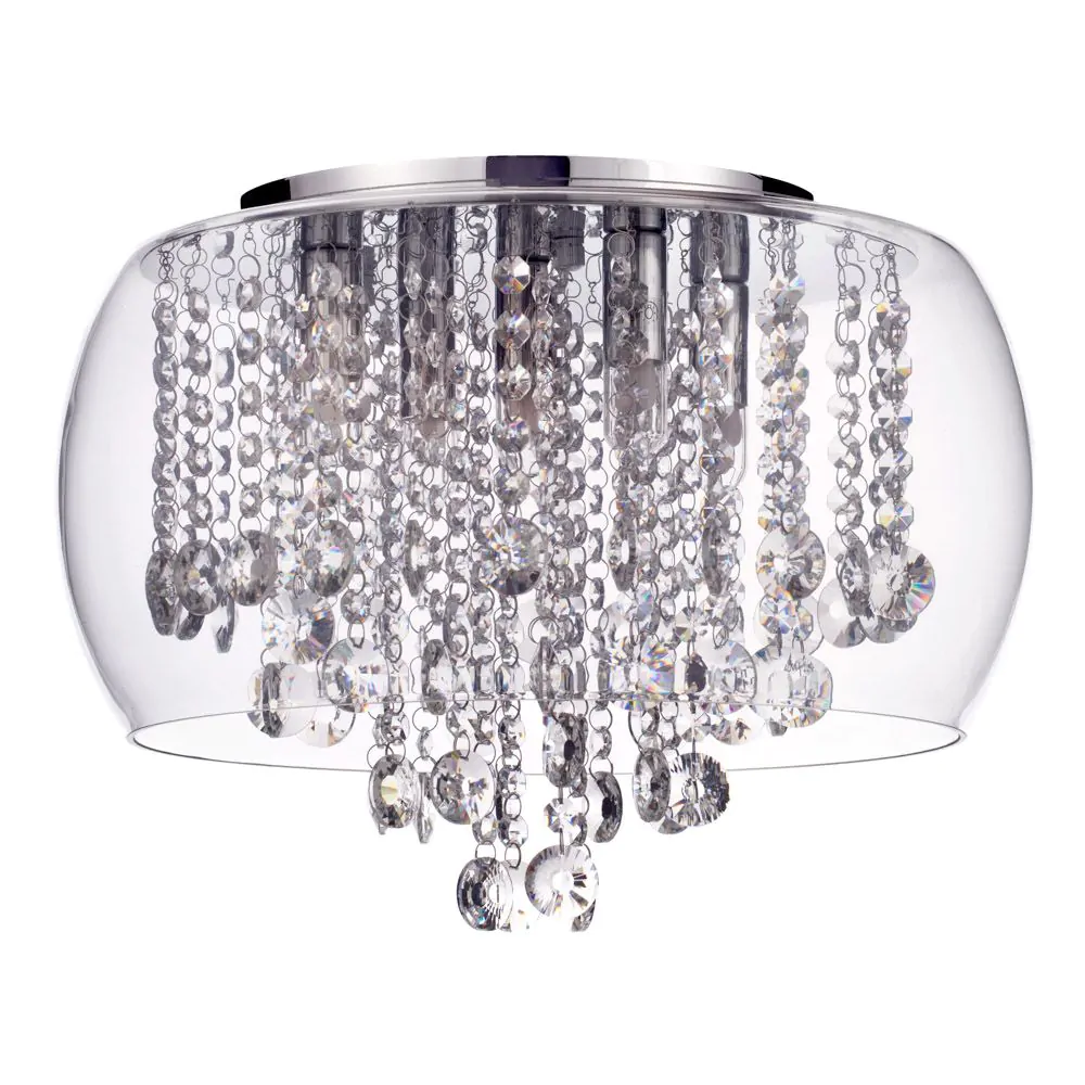 Decorative lighting style for modern interiors with the Nore Small Encased Flush. This ceiling light features a flush design that is ideal for low ceilings and comes in a chrome finish that looks perfect in contemporary decor, with an array of luxurious crystal effect droplets encased within a glass bowl. It also has an IP rating of 44 meaning that it is sufficiently water resistant enough to be installed as a bathroom ceiling light.