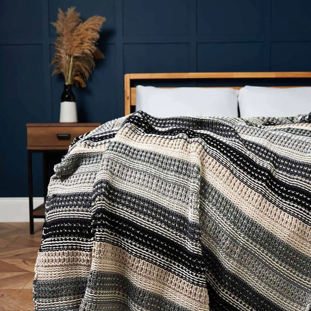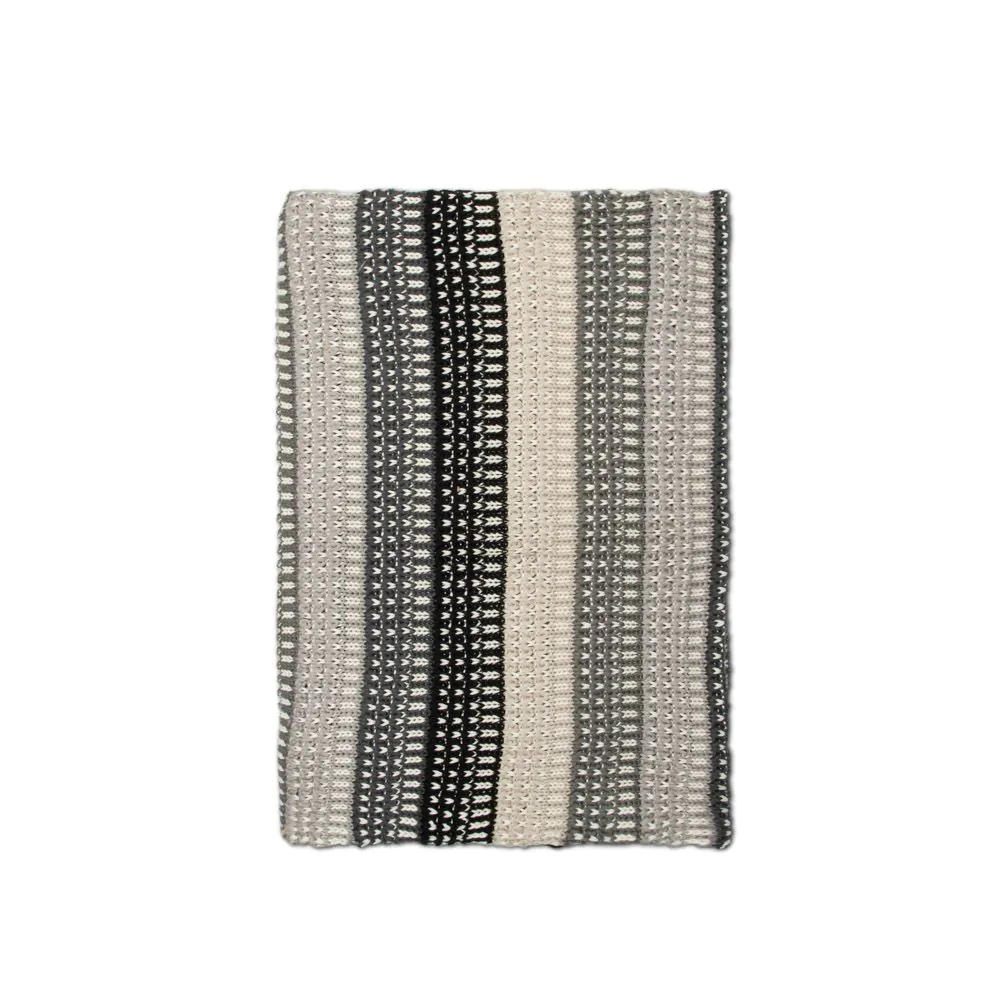Elevate your decor with our Ombre Knitted Throw in Tonal Grey. This 125 x 150cm throw features a beautiful striped ombre design that transitions from light to dark grey tones. Crafted with care, it’s a stylish addition to your living room or bedroom, looking ideal on any chair, couch or bed.