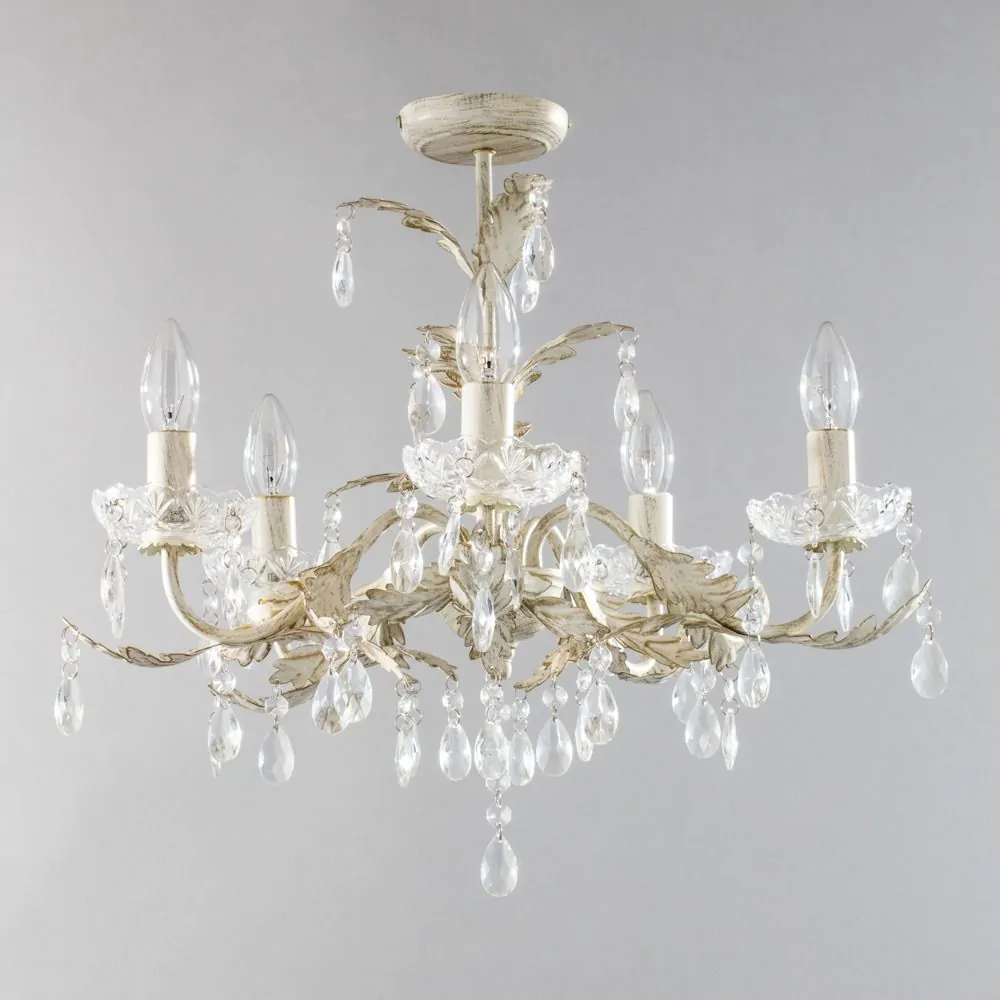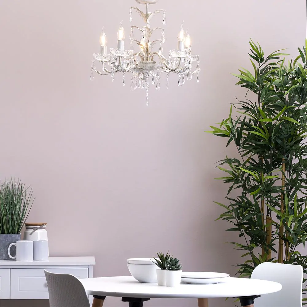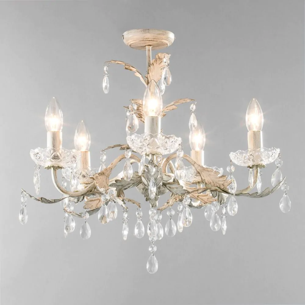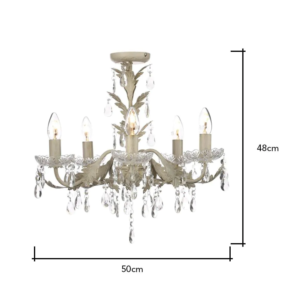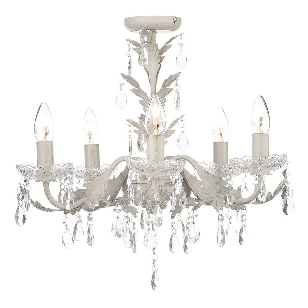The Paisley Flush Chandelier provides a beautiful, glamorous look to your home, creating a statement among any interior style. The 5 light configuration features a beautiful feathery design that holds 5 candle-like lighting features, giving off optimal light and a decorative look in any room. Cascading in crystal effect droplets, the light shimmers, and shines through your room, making it a perfect centrepiece in any living room or dining room.
