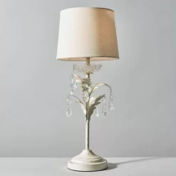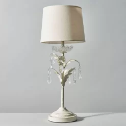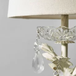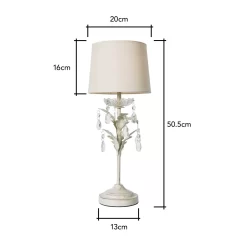Enhance your tablescapes with the Paisley Table Lamp in Cream and Mushroom tones. The combination of these hues with the white shade adds depth and visual interest, making this lamp a functional and artistic addition to your décor. Whether placed on a side table or bedside, it provides both illumination and style with gorgeous decorative crystal effect droplets.