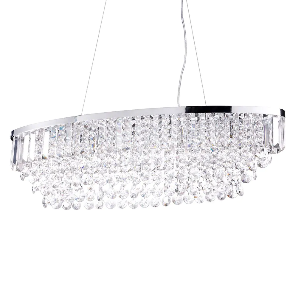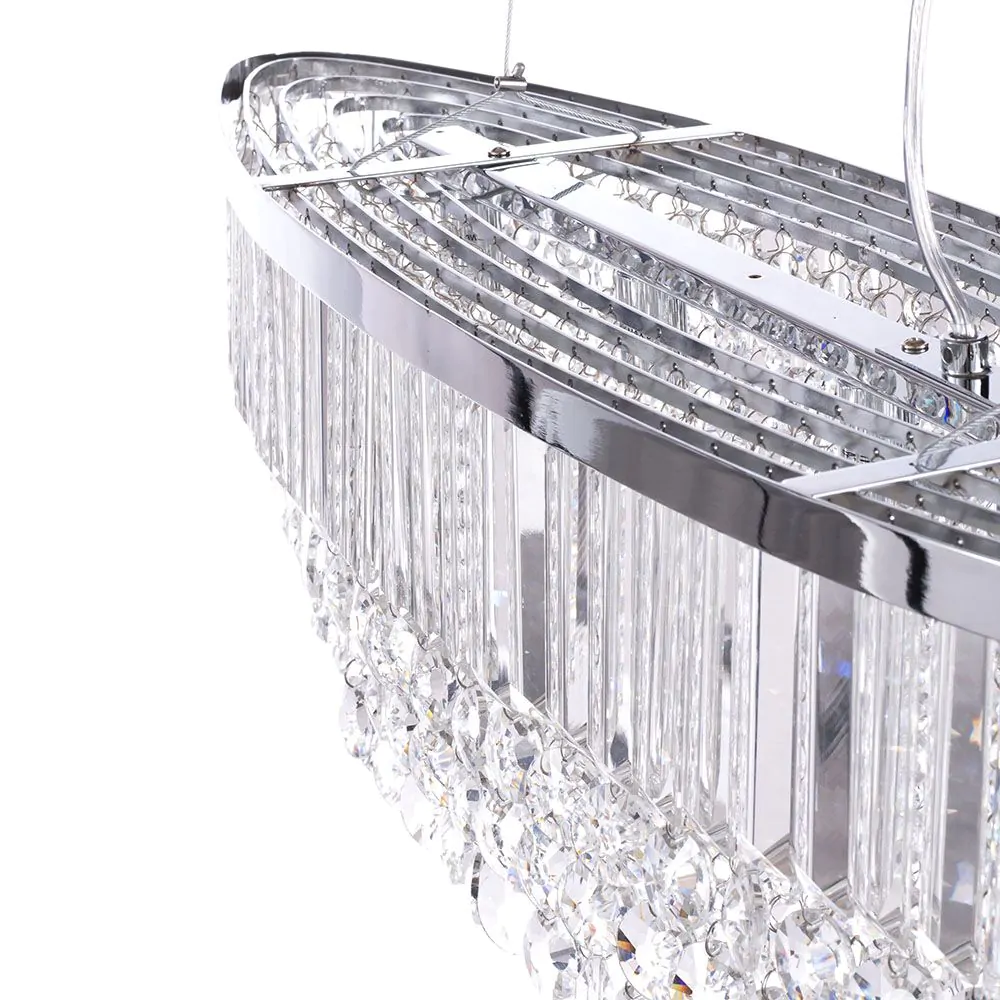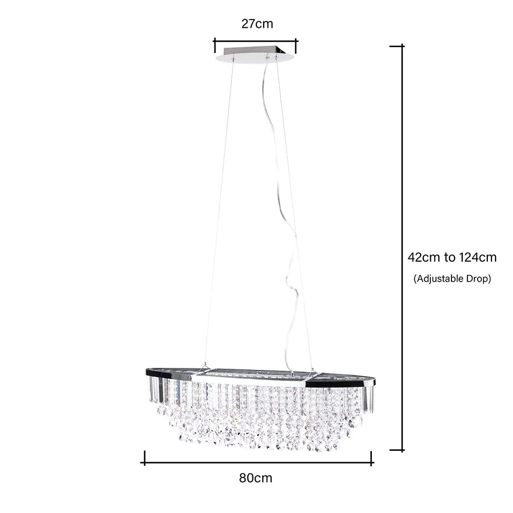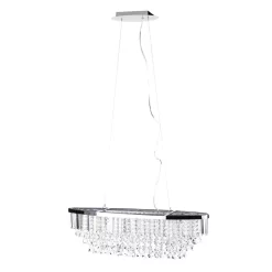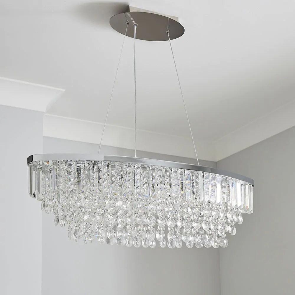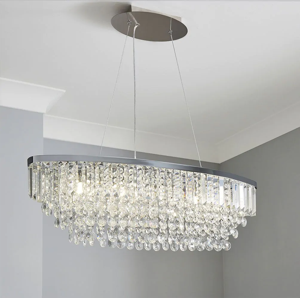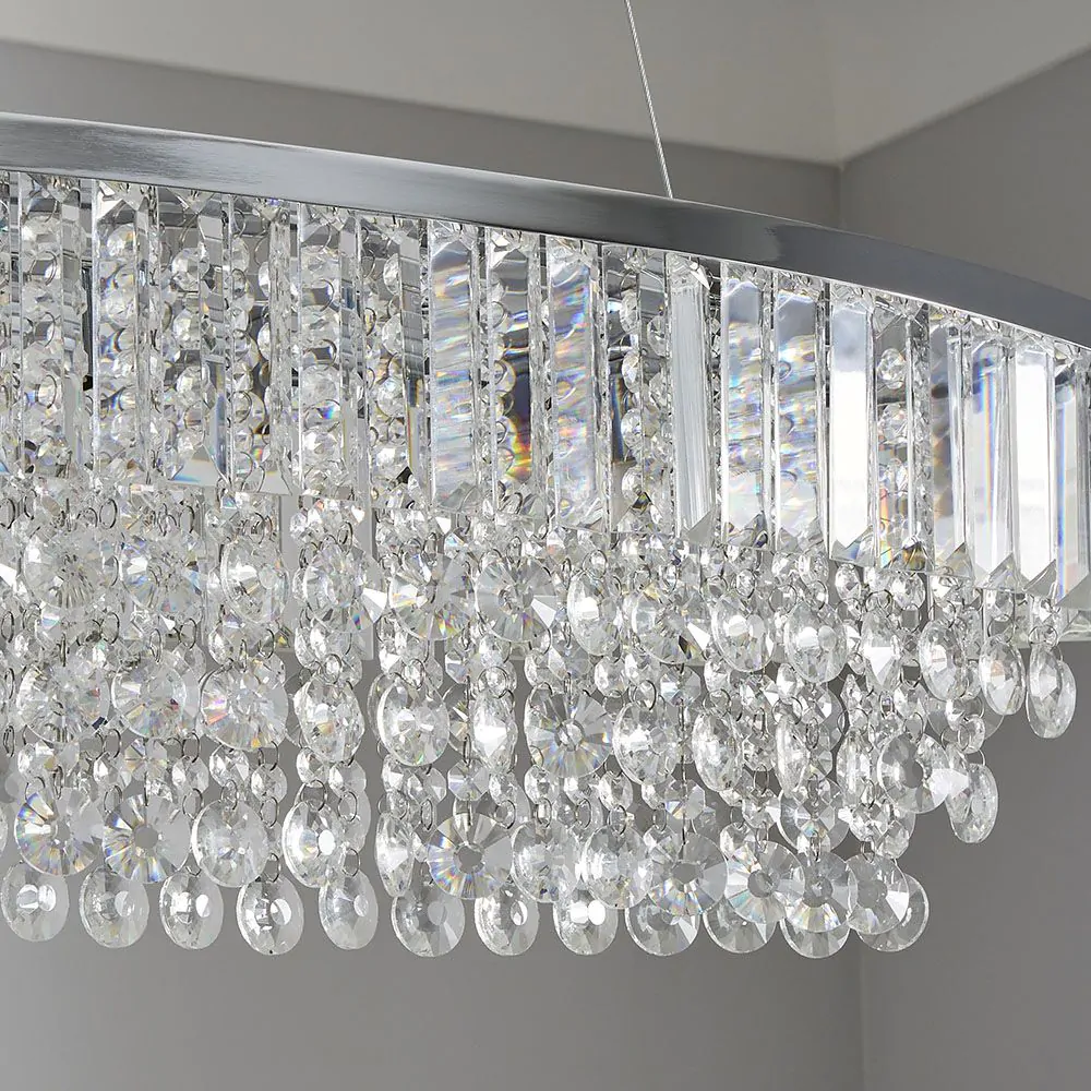 Light up your dining room with the stunning Paladina Oval Diner Pendant. Finished in chrome, this ceiling fitting is detailed in an assortment of crystal effect prisms that gorgeously cascade – shining and shimmering as they catch the warm glow of light from within. The pendant bar can be styled gorgeously over a dining table, kitchen island or breakfast bar for an elevated sophistication and elegance within your rooms while providing the space with a proficient illumination.