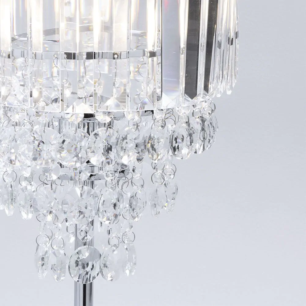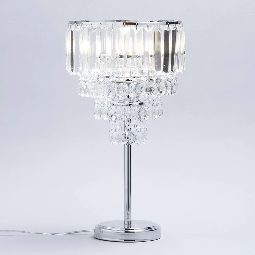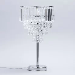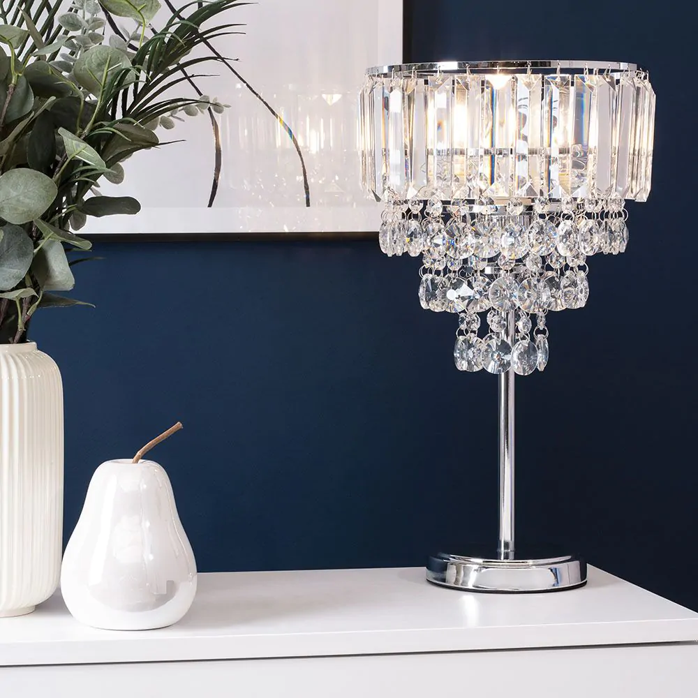 Elevate your home with stylish decorative lighting. The Paladina Table Lamp is the perfect accent light to add glitz and glamour to your home décor, featuring a trendy chrome finish that will complement any contemporary interior. This modern table lamp combines traditional crystal effect details with an updated sleek chrome look, making it a great choice for adding decorative touches to side tables in hallways, living rooms and bedrooms.
