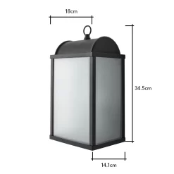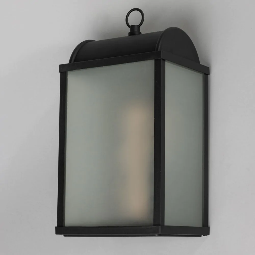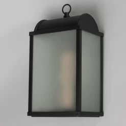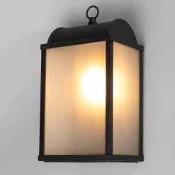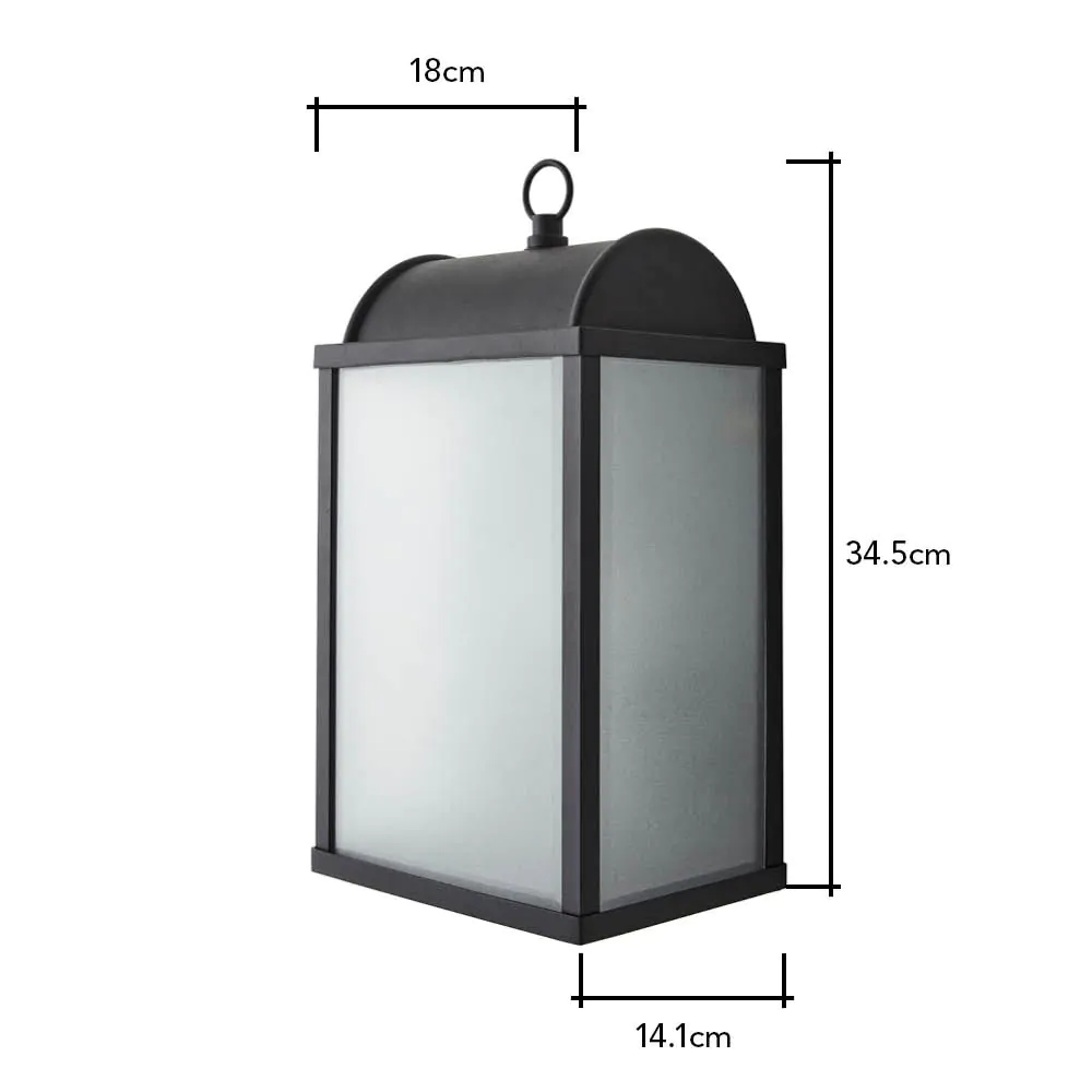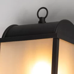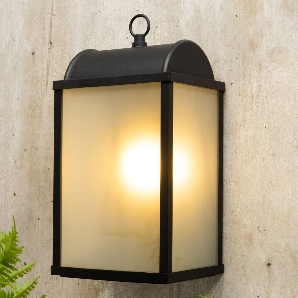 Get an elegant lighting style for the outside of your home with the Rhys Box Frame Outdoor Wall Light. This lantern is IP44 rated to ensure water resistance against outdoor weather conditions and is finished in black for a modern appearance. It also has gorgeous frosted glass panels which diffuse a soft glow outwards.