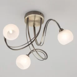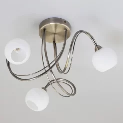 - Antique brass finish is complemented by alabaster shades;