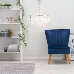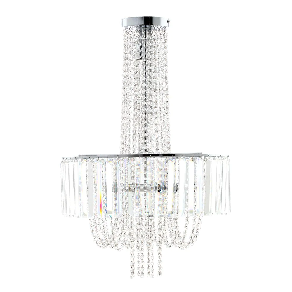 The Tamara chandelier has hundreds of sparkling crystals that drop down from a chrome ceiling plate and rise up on a chrome hoop. The way the crystals rise and fall throughout this light really adds texture and depth to its appearance. If you want your lighting to get noticed then Tamara is the light for you. When lit up, the hundreds of crystals shine bright. This light is a real show stopper. This vintage inspired chandelier, with its beautiful opulence will make a strong centre piece within a living room or hallway.