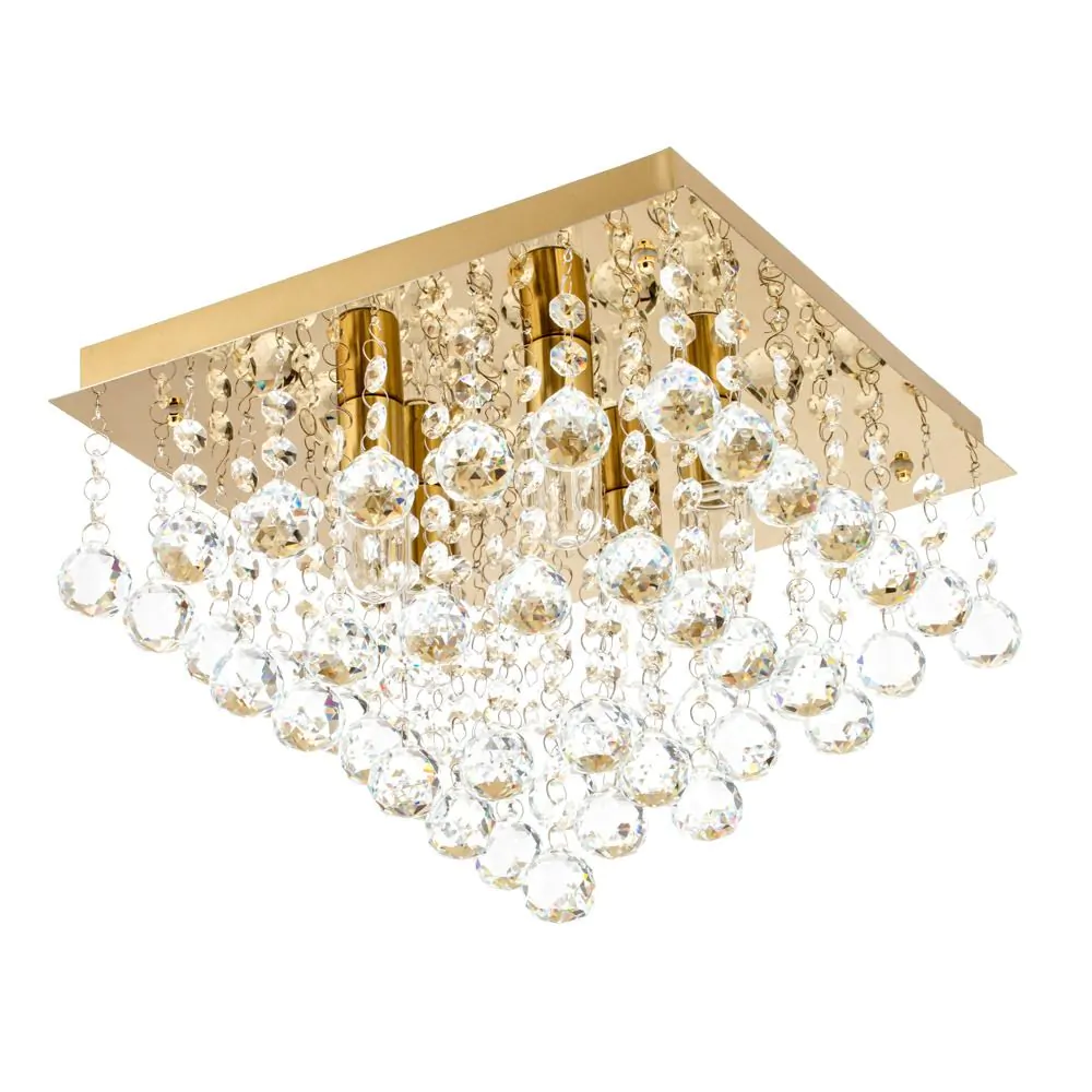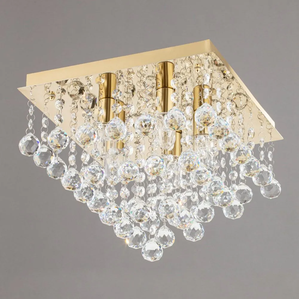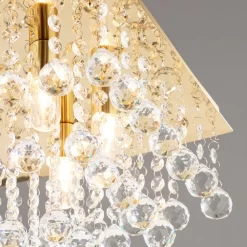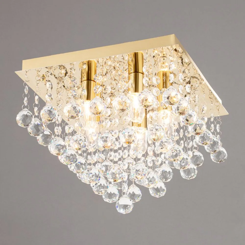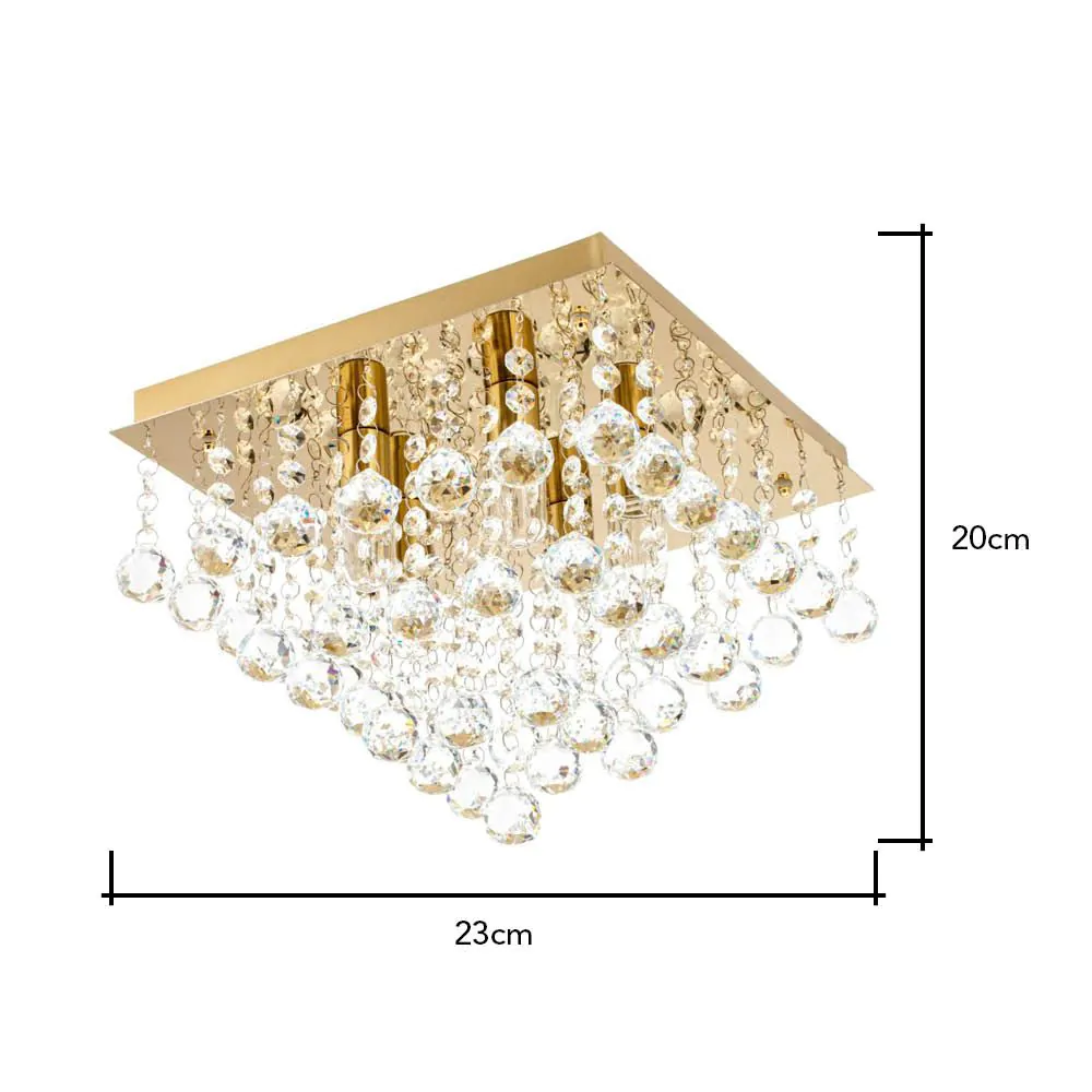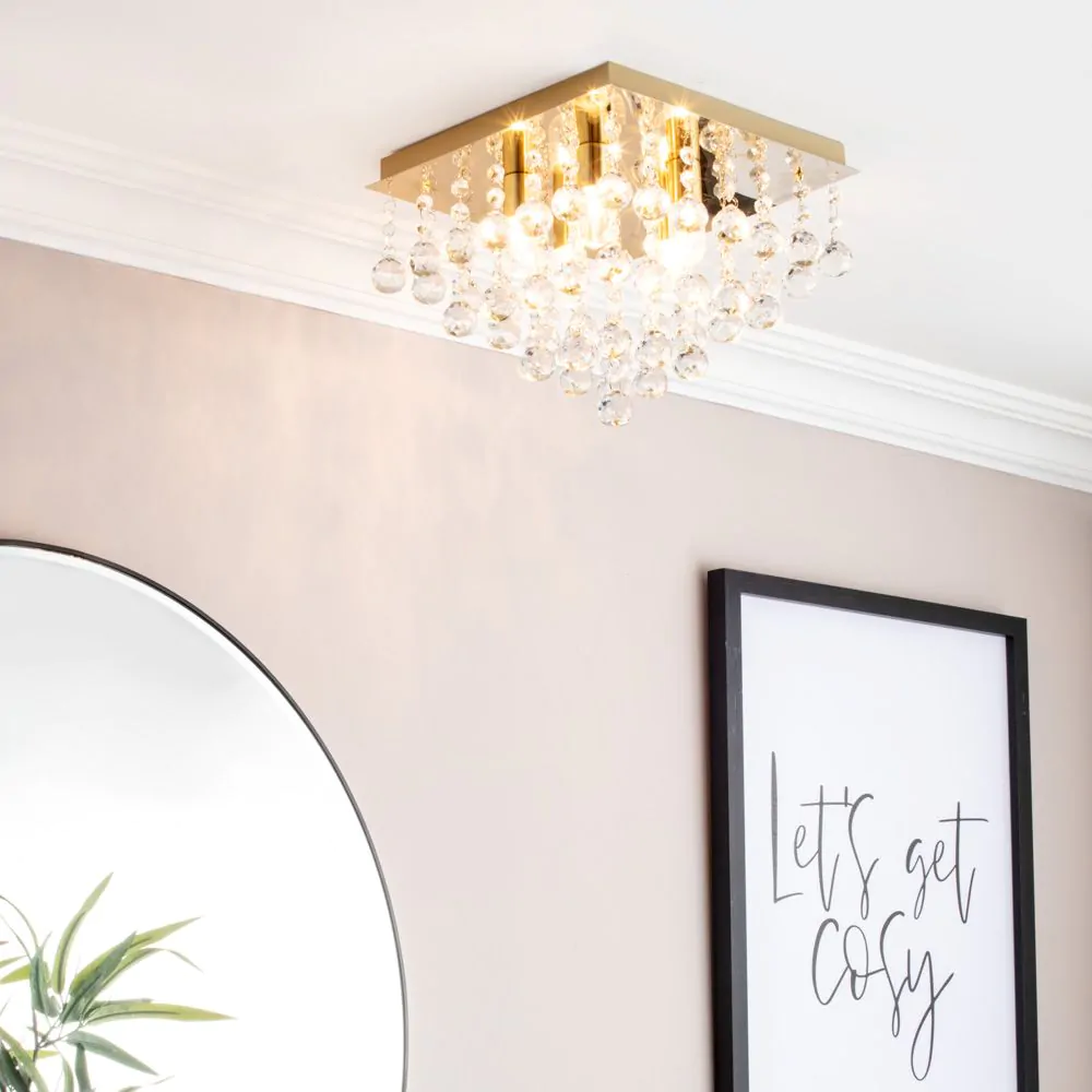 Refine your bathroom with the Large Tampa Bathroom Square Flush Ceiling Light. Flush lights are ideal for interiors with low ceilings that are looking for practical lighting that doesn’t compromise on style. Featuring a square base and a satin brass finish that fits perfectly with modern bathrooms. Crystal effect droplets hang from the base catching the light as it shines out for a gorgeous sparkle effect. This ceiling light is suitable for bathroom zones 2 and outside zones due to its IP44 rating.