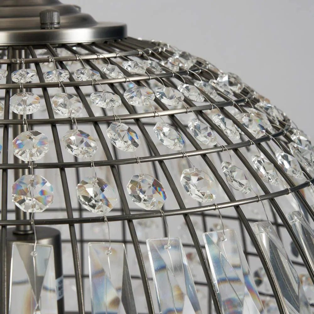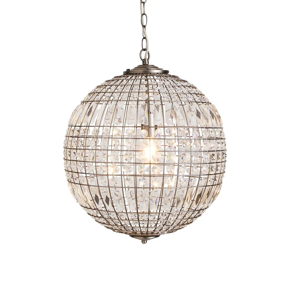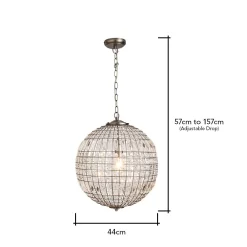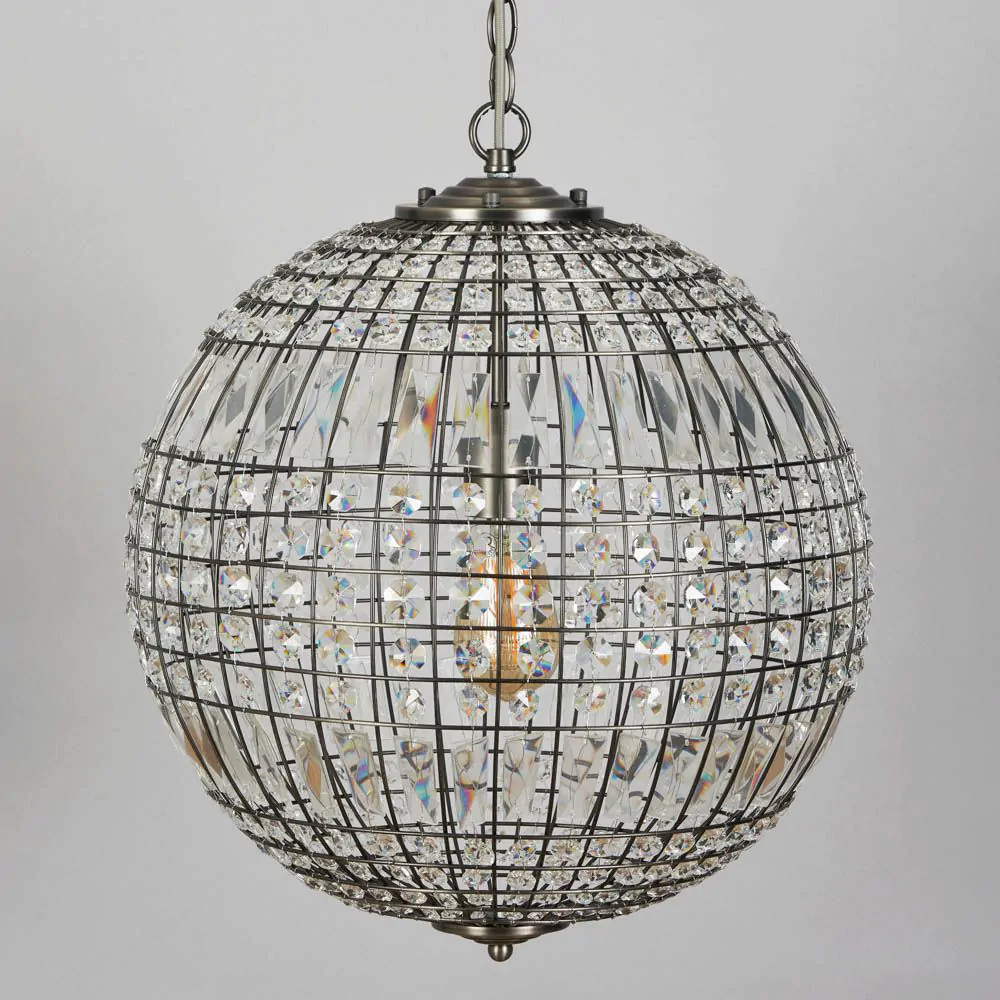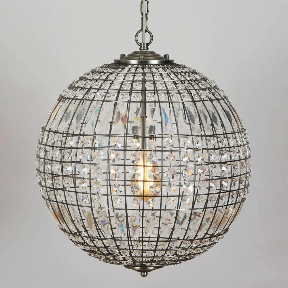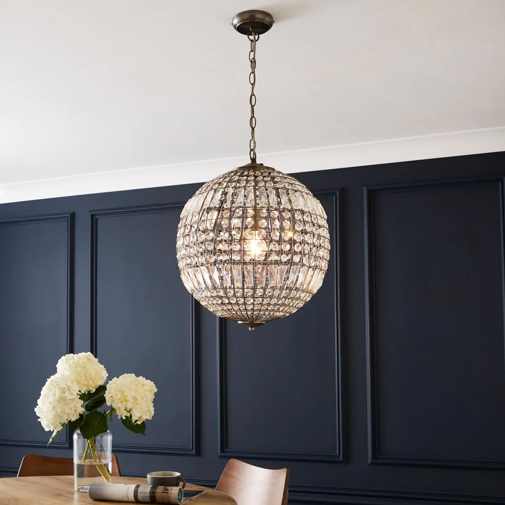 Add a stylish aesthetic to your living room or dining room with the Terri 1 Light Large Glass Crystal Ball Pendant. This ceiling light is ideal for styling in twos or threes over a kitchen island or dining table and is guaranteed to bring a statement look to your home. It also comes in a pewter finish for a refined and sophisticated appearance, and is decorated in crystal effect prisms which reflect the light outwards, casting rainbows across your decor.