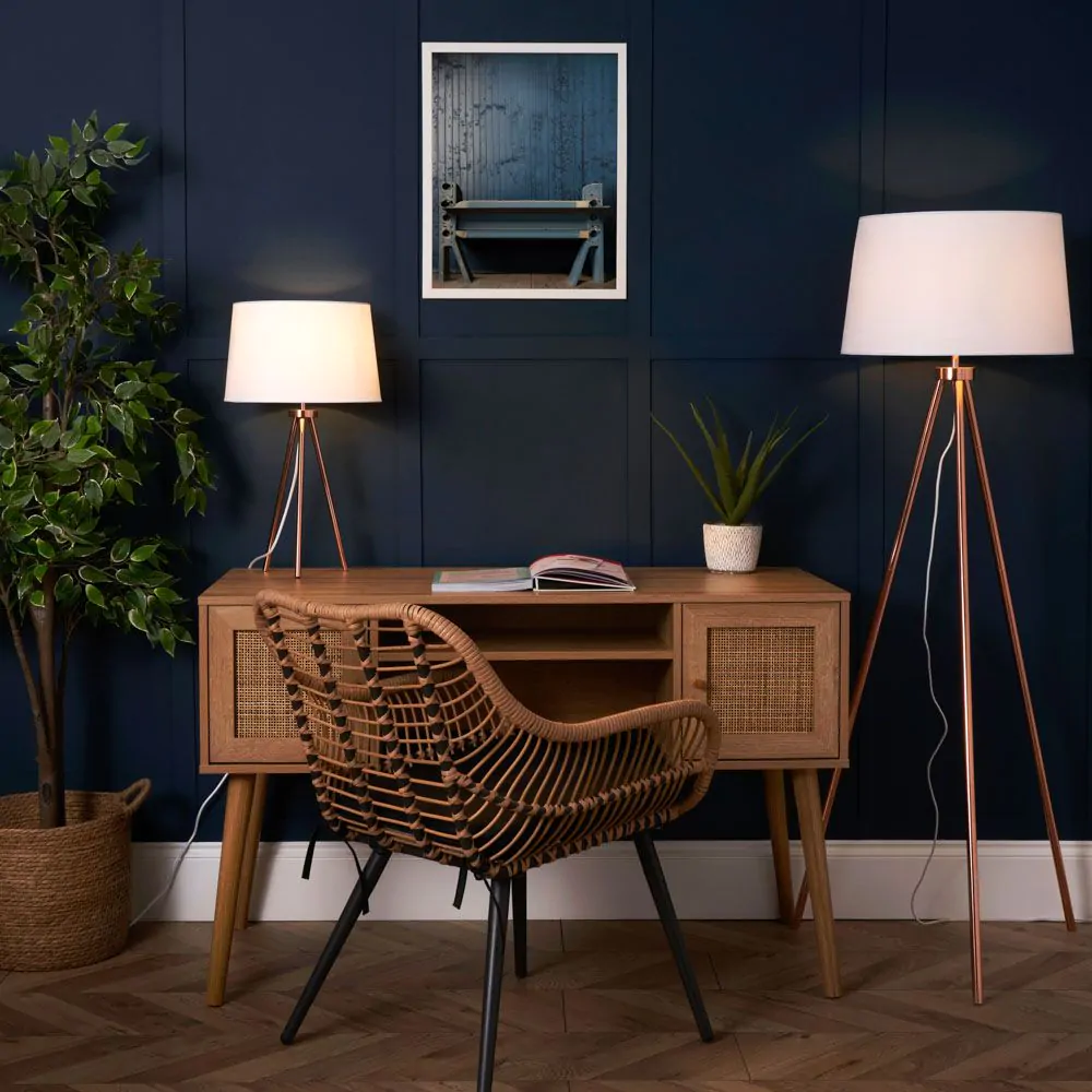 Light up your living room with the stylish Tristan Tripod Table Lamp. The signature tripod legs add a contemporary twist to the table lamp as they hold the conventional ivory light shade. The copper finish adds a trendy aesthetic to the table lamp that would work beautifully against a stylish, statement wall. Style this lamp on your living room side tables to achieve the perfect cosy mood as you unwind at the end of a long day.