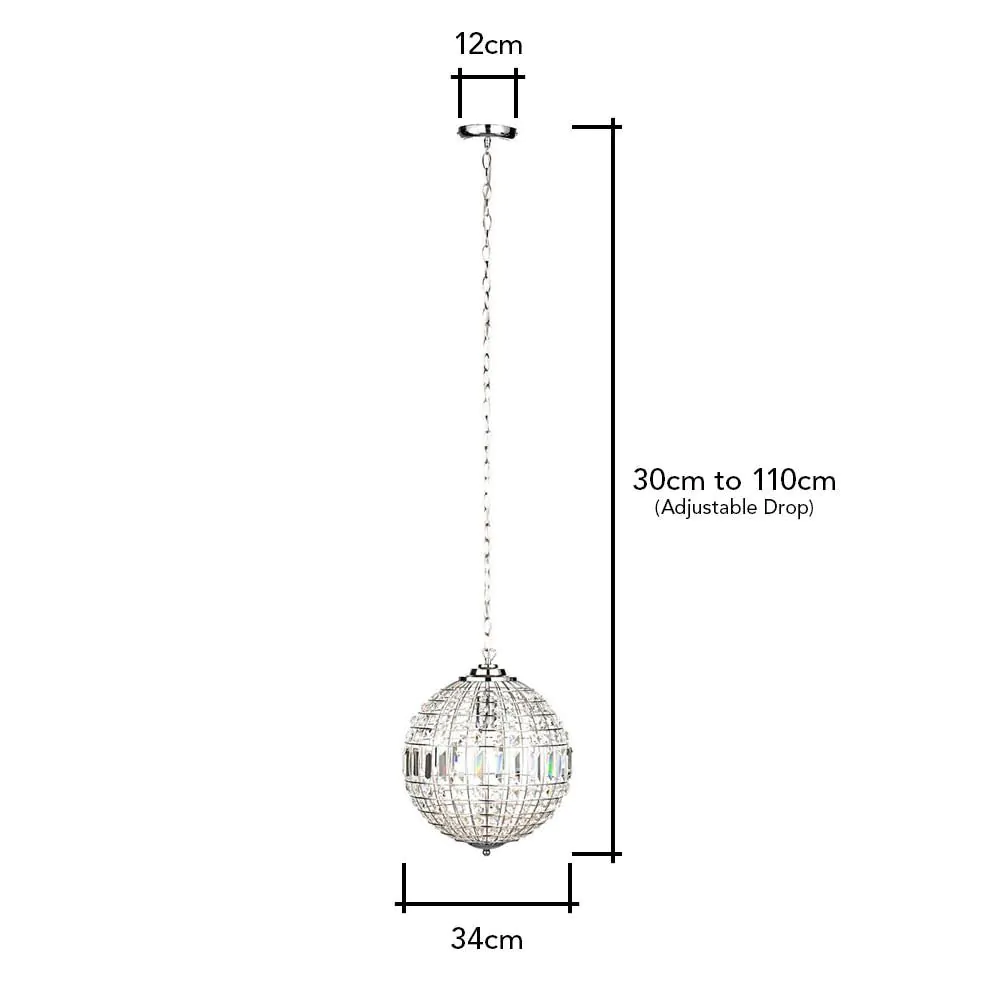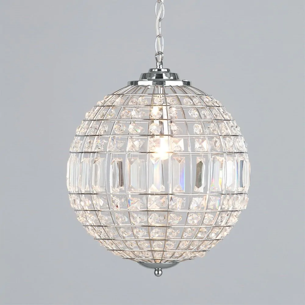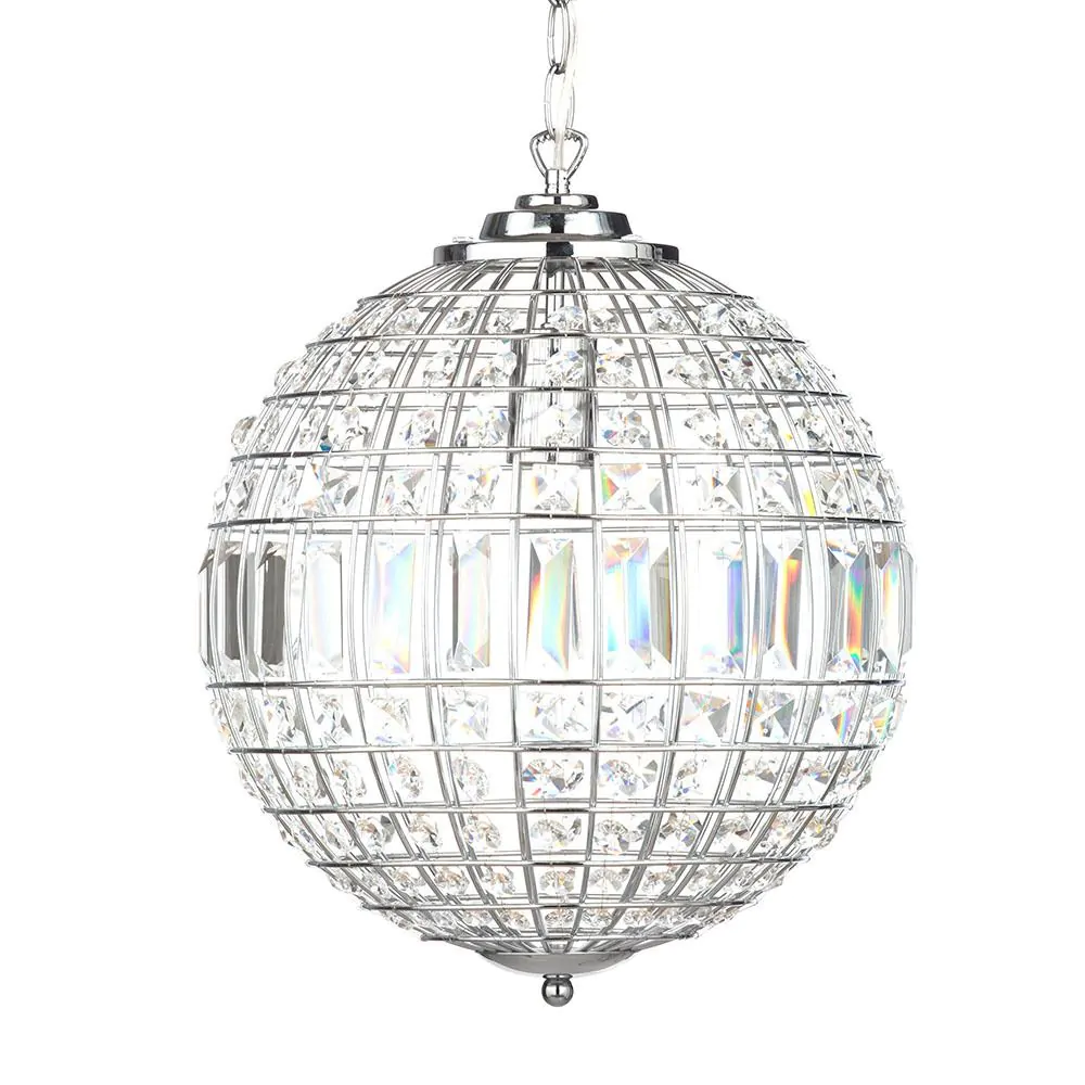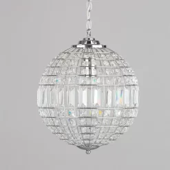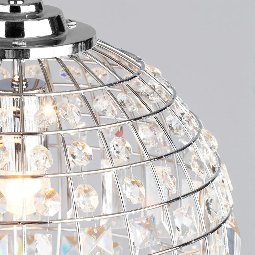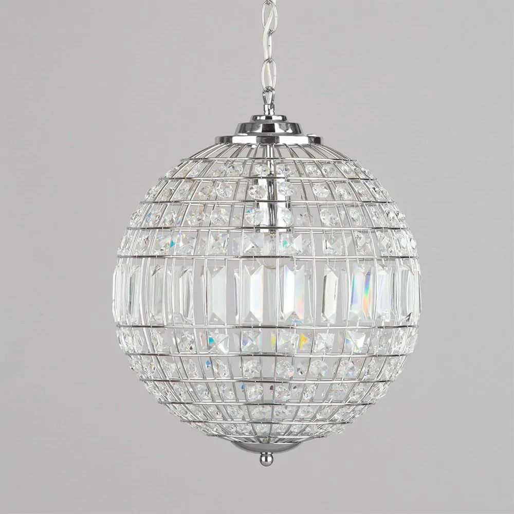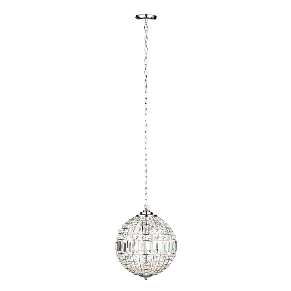 Pendant lighting is one of the boldest and most eye-catching options available, giving a statement centrepiece to any décor. The small Ursula crystal ball pendant finds a brilliant balance between a modern tone and an elegant theme, creating a fresh, updated image that remains sophisticated. The chrome ball structure is decorated with crystal effect droplets, which catch the light as it shines out across the room, giving a glamorous shimmer and twinkle to the space. Hanging from the ceiling by a sturdy chain, this fitting is perfect as an elegant focal point in your dining room or lounge!