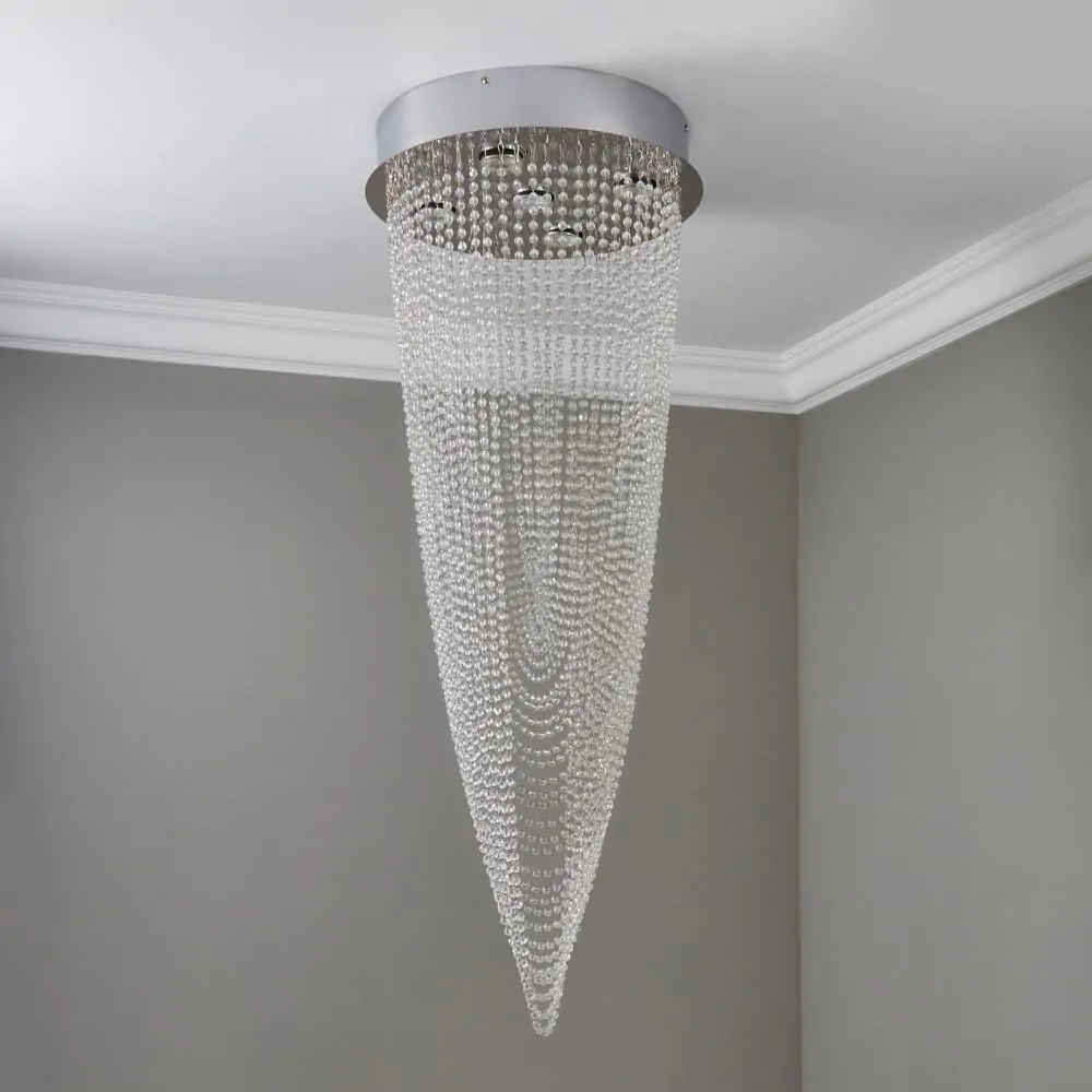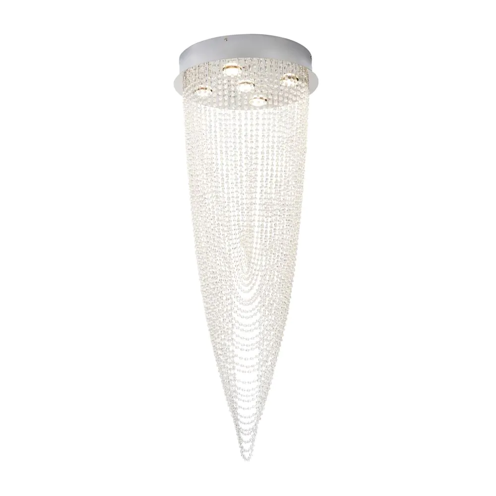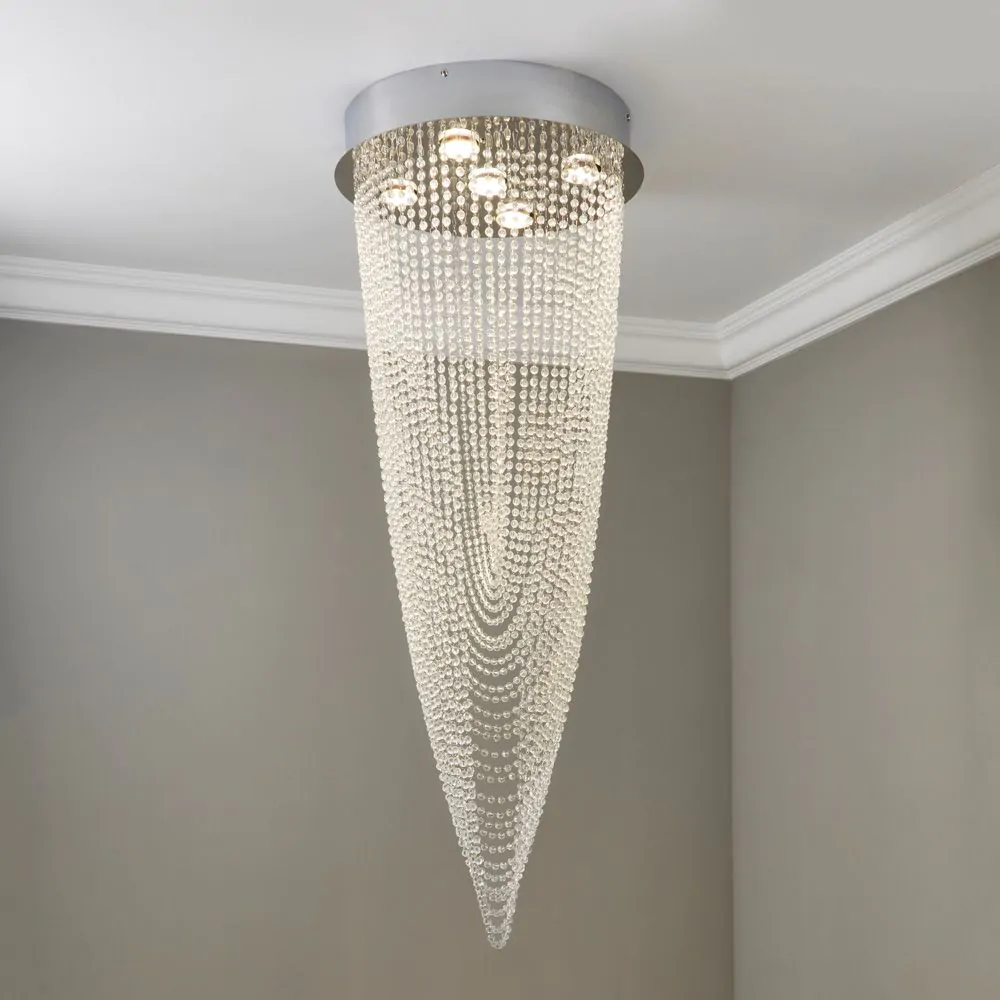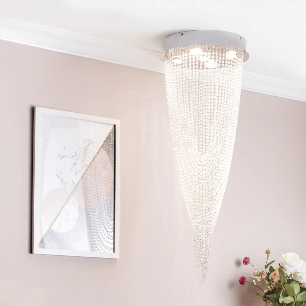 Finished in chrome, our beautiful Valerie 5 Light Ceiling light adds a glamorous statement to any home, with an arrangement of crystal effect droplets beautifully cascading from the circular ceiling plate in a gorgeous, draping fashion – shining beautifully as the lights above illuminate a soft glow down into the room. In a spiralling motion, the draped detailing is ideal for creating a statement centrepiece to your interiors, looking fabulous in the centre of your living room or bedroom.